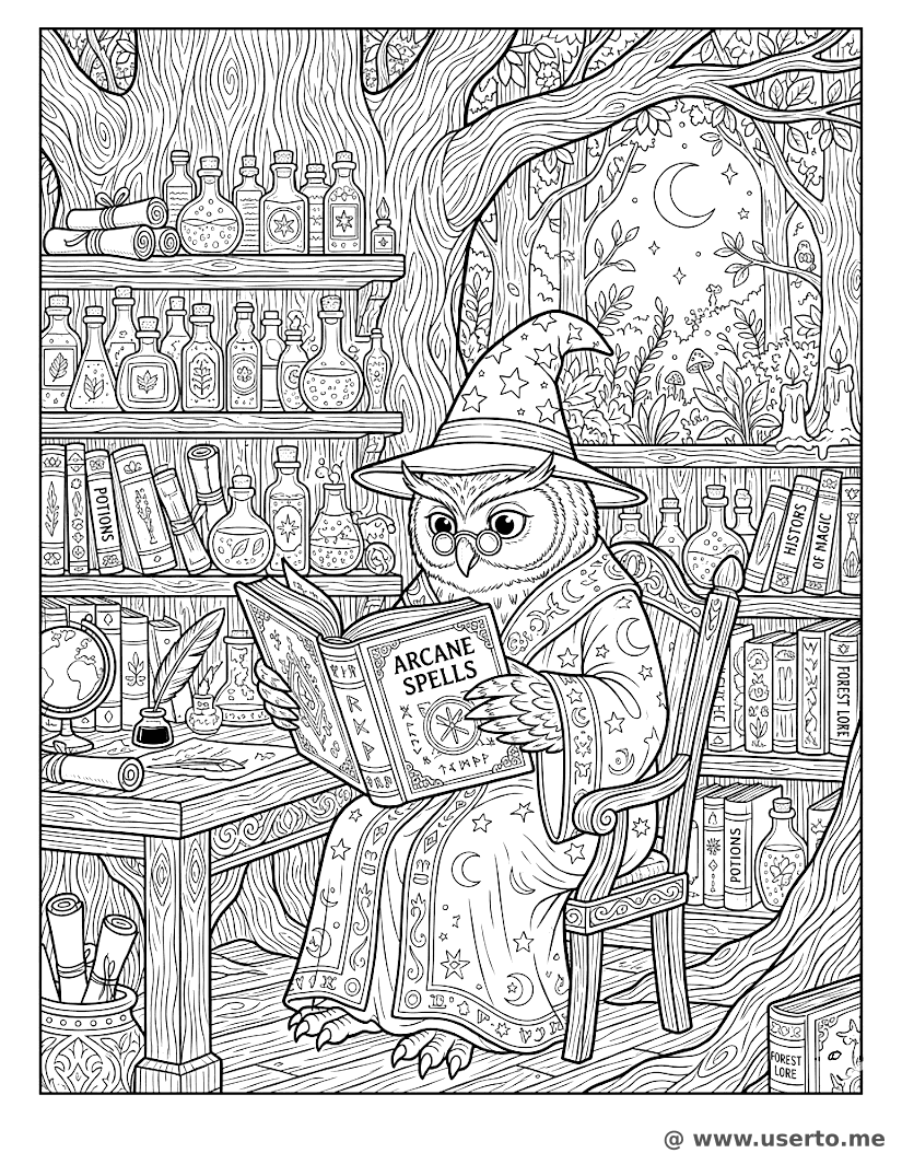 Die Baumhaus-Bibliothek des Eulen-Zauberers - Kostenloses AI Coloring Book: To Me