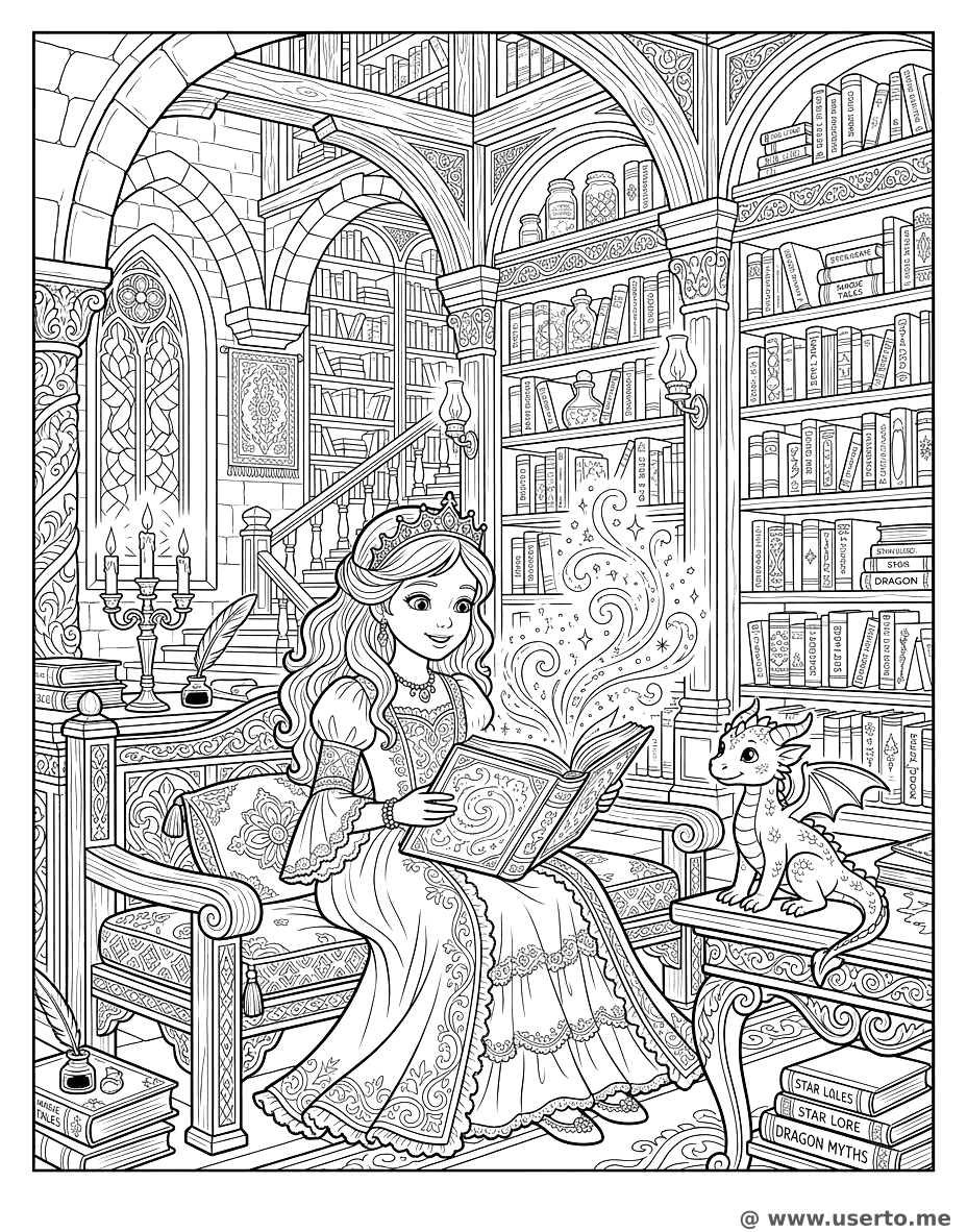 descriptionDie Prinzessin und die magische Bibliothek Coloring Page Description