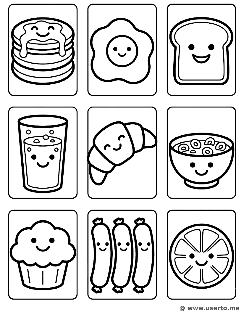 Ein lustiges Gittermuster mit lächelnden Pfannkuchen, Eiern und Toastscheiben zum einfachen Ausmalen.
