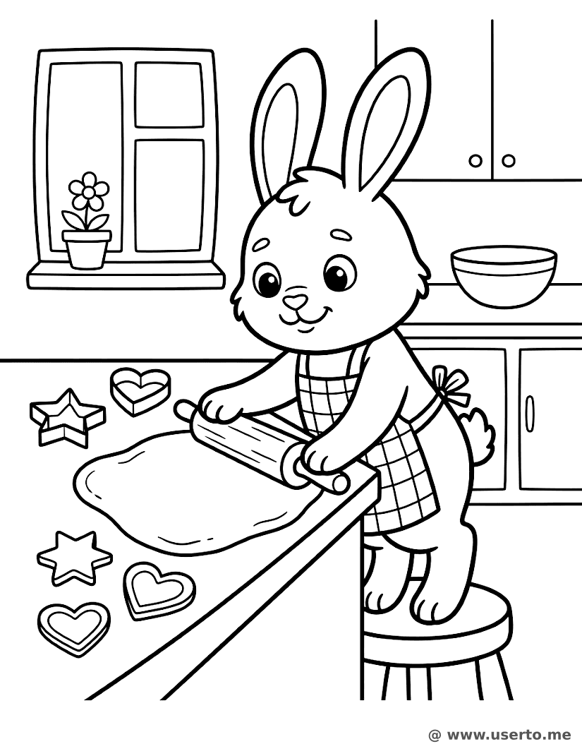 Kleiner Hase beim Keksebacken - Kostenloses AI Coloring Book: To Me