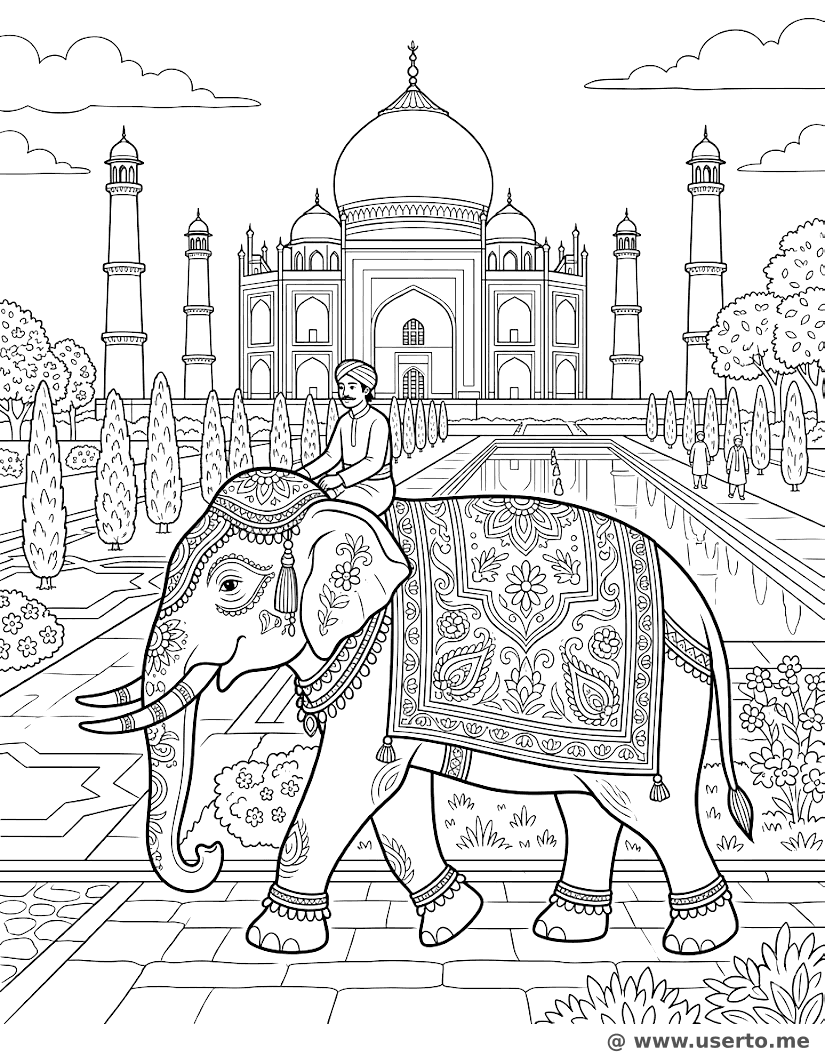 Königlicher Elefant am Taj Mahal - Kostenloses AI Coloring Book: To Me