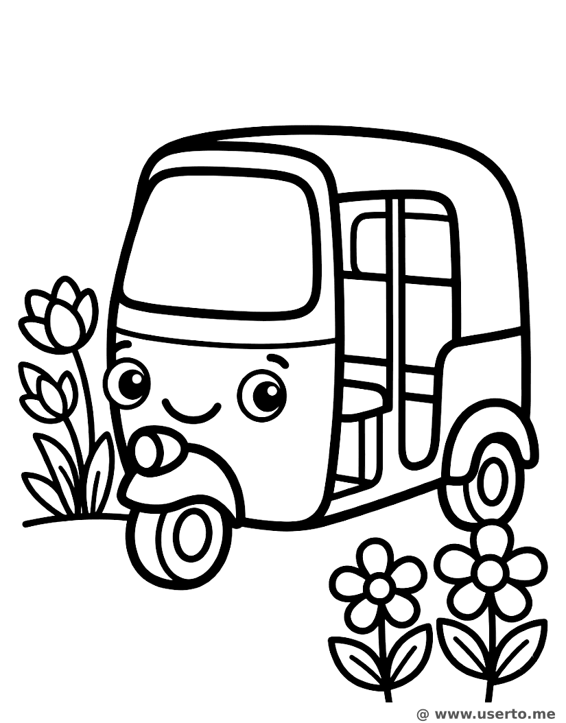 Lächelndes Tuk-Tuk im Garten - Kostenloses AI Coloring Book: To Me