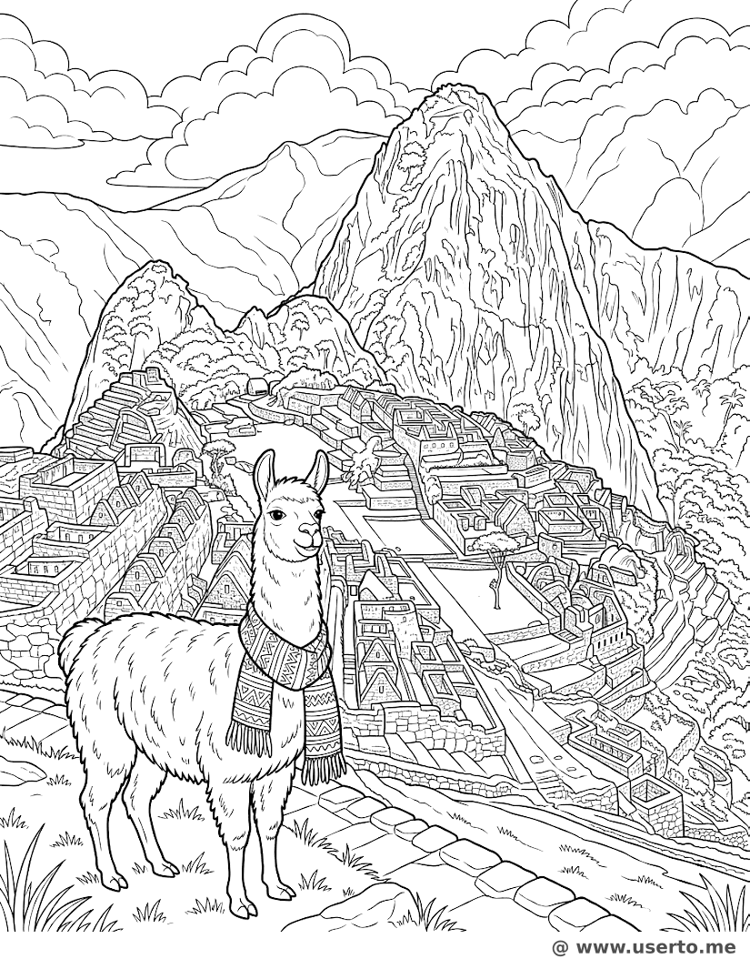 Lama-Reise in Machu Picchu - Kostenloses AI Coloring Book: To Me