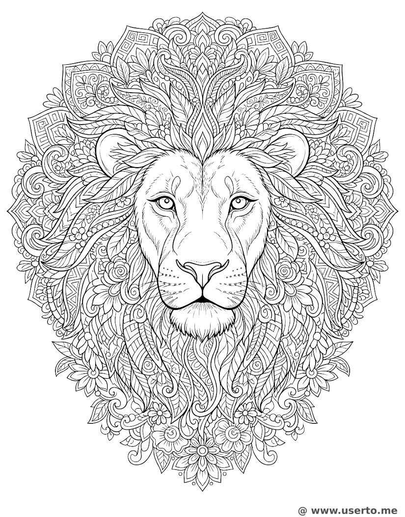 Eine kunstvolle Löwenmähne aus komplexen, symmetrischen floralen und geometrischen Mustern.