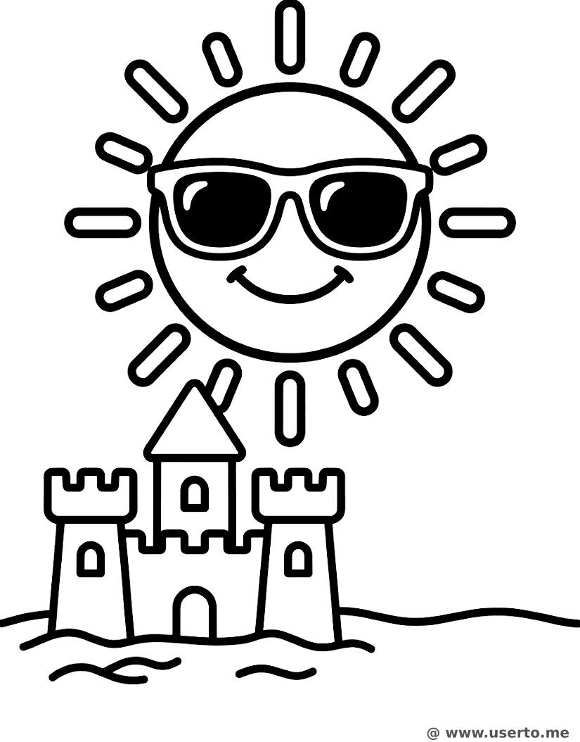 Eine große, freundliche Sonne mit cooler Sonnenbrille blickt auf eine einfache Sandburg am Ufer hinab.