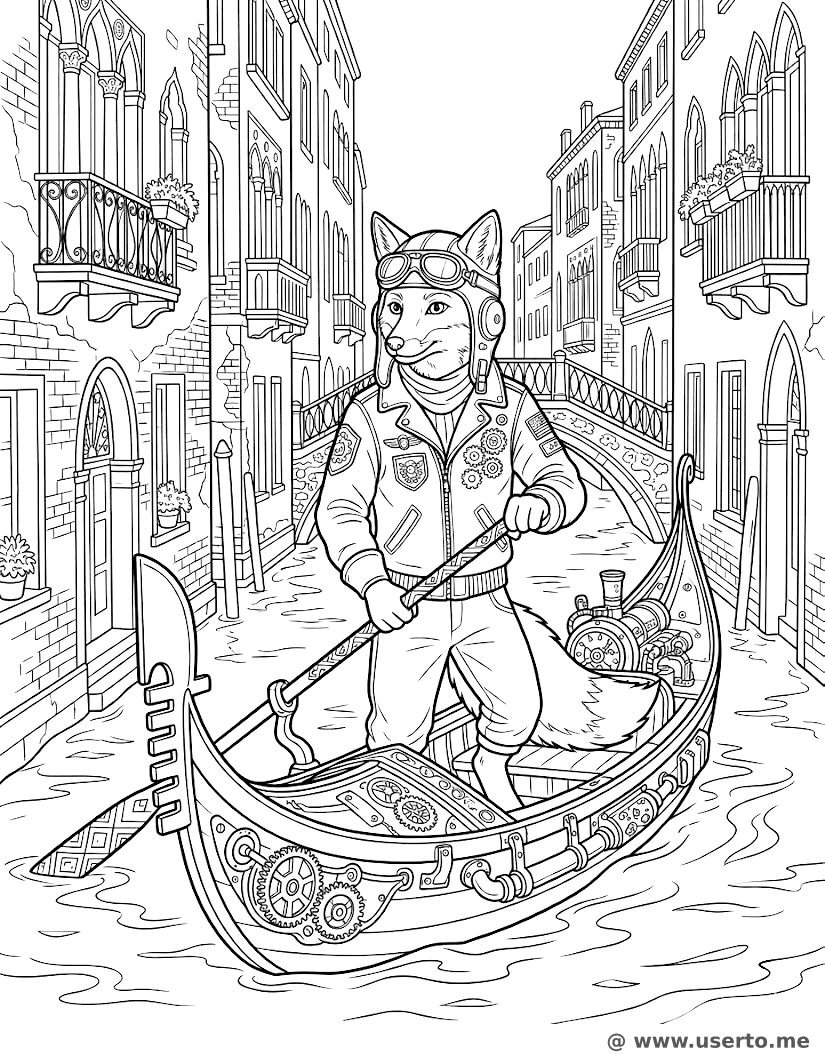 Steampunk-Fuchs in einer Gondel - Kostenloses AI Coloring Book: To Me