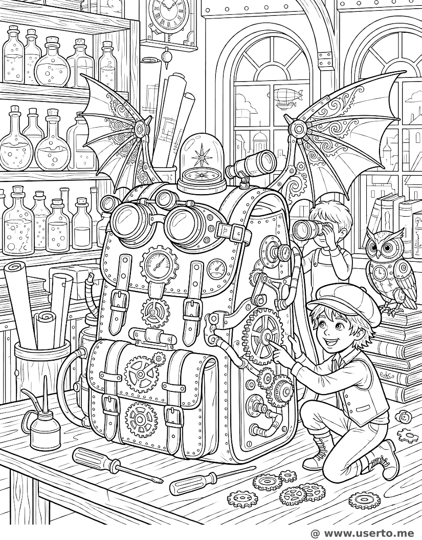 Steampunk-Rucksack-Labor - Kostenloses AI Coloring Book: To Me