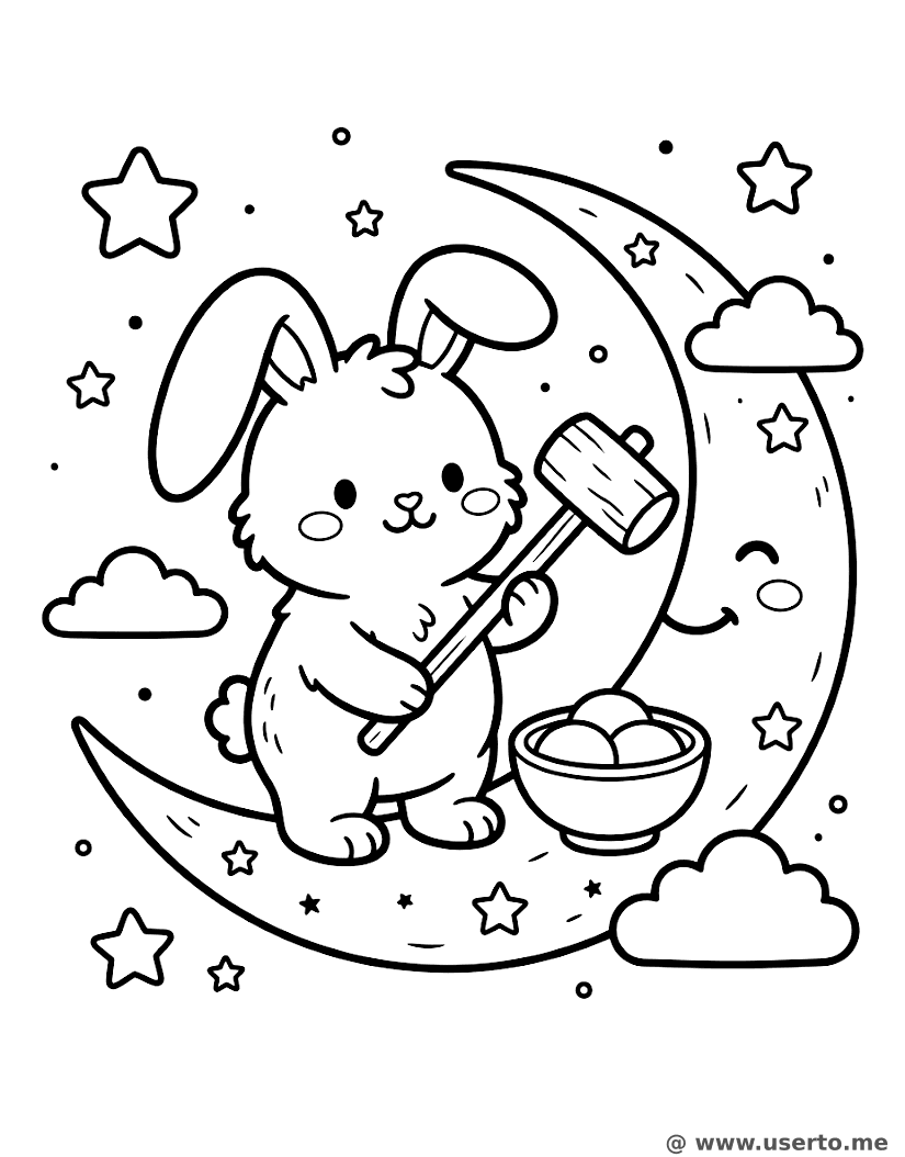 Ein flauschiger Hase auf dem Mond, der mit einem Holzhammer traditionelle Reiskuchen für das Mondfest herstellt.
