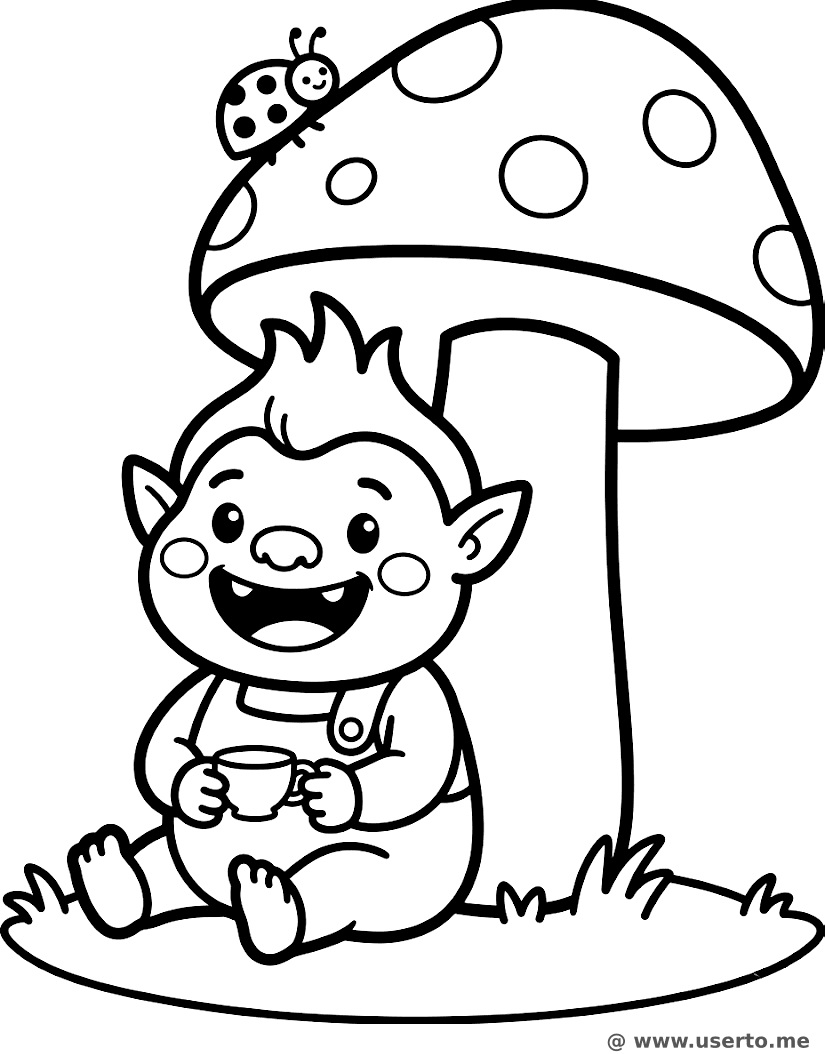 Ein fröhlicher, knubbeliger Troll veranstaltet unter einem Riesenpilz eine winzige Tee-Party für eine Marienkäfer-Freundin.