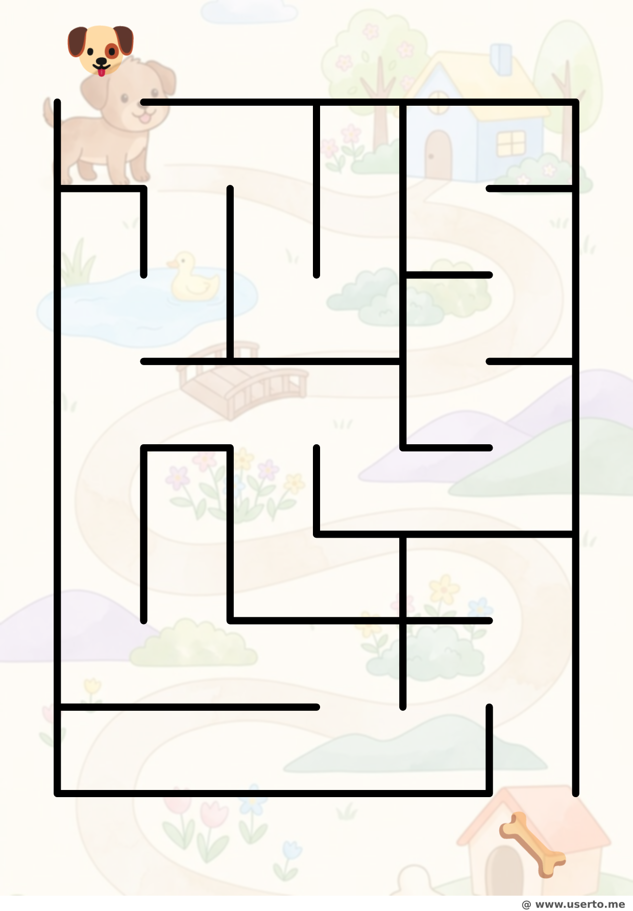 Ein sehr einfaches Labyrinth mit breiten Wegen für Kleinkinder, um einem süßen Welpen zu helfen, sein Lieblingsleckerli zu finden.