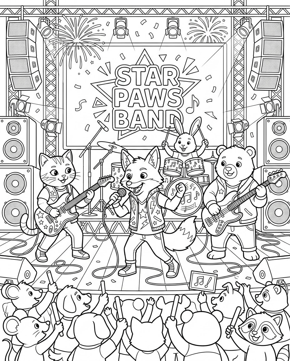 Animal Idol Grand Concert is a popular concert, idol, group, stage, lights themed page in the K-Pop Icons category. Print this free AI-generated coloring sheet to help your child develop fine motor skills and creativity. High-resolution image optimized for A4 paper is available for instant download.