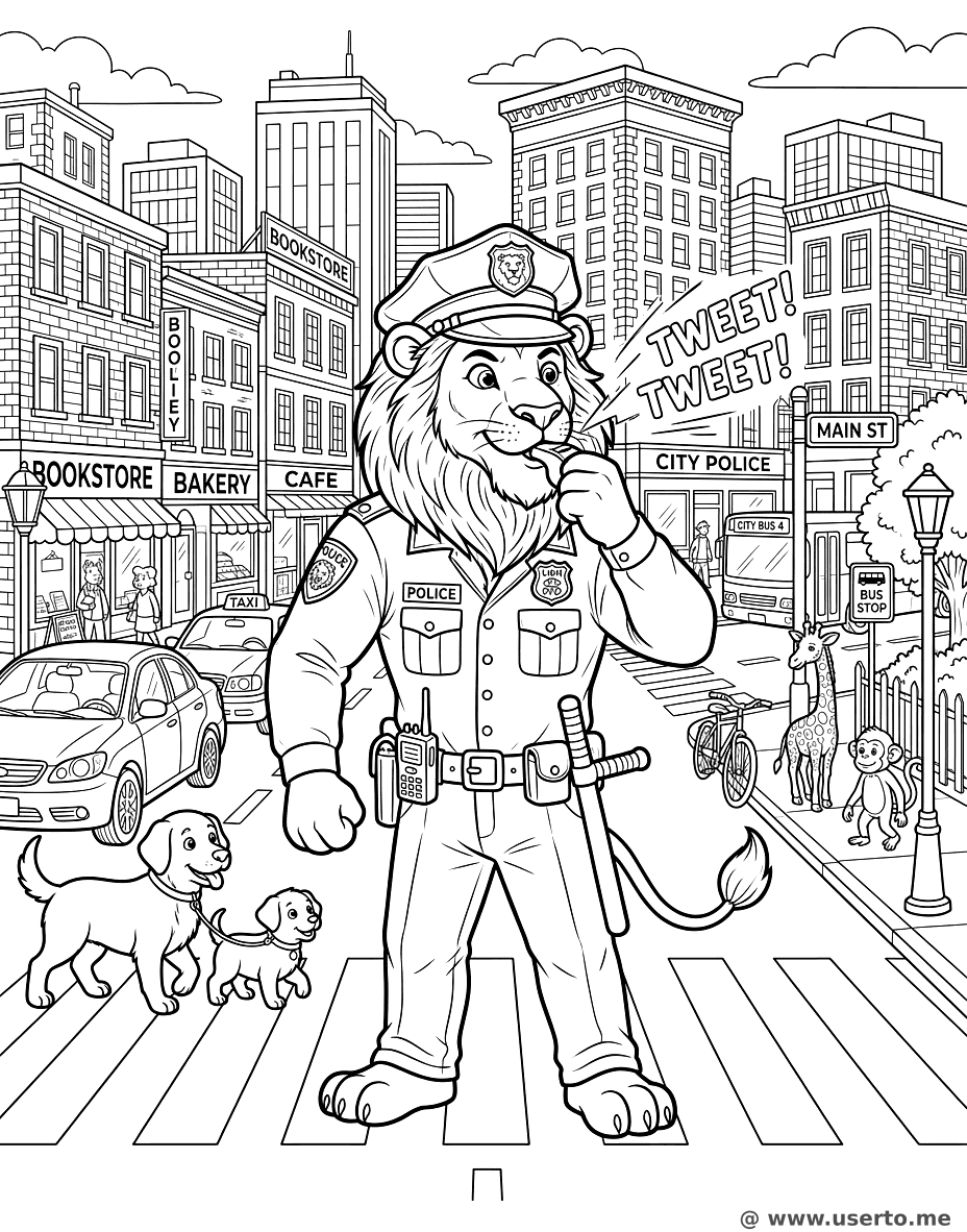 Brave Lion Police Officer is a popular lion, police, city, justice, detailed themed page in the Jobs & Work category. Print this free AI-generated coloring sheet to help your child develop fine motor skills and creativity. High-resolution image optimized for A4 paper is available for instant download.