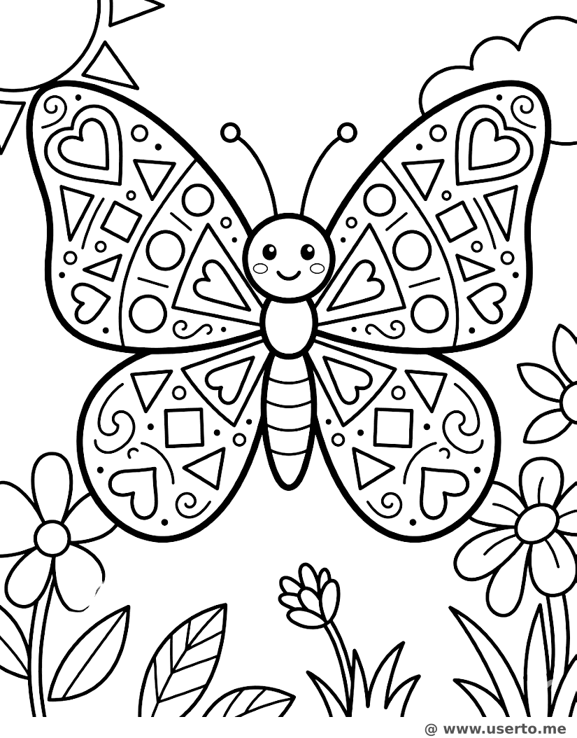 A butterfly with wings featuring symmetrical geometric shapes and heart patterns.
