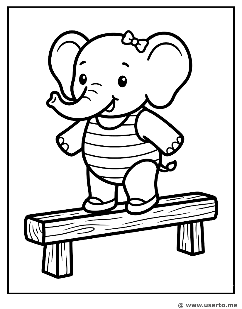 A happy elephant balancing carefully on a gymnastics beam wearing a cute leotard.