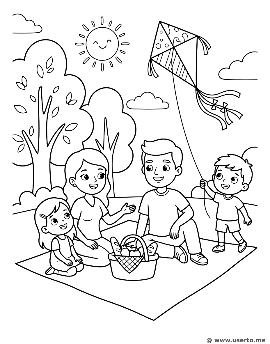 descriptionFun Family Picnic and Kite Flying Coloring Page Description