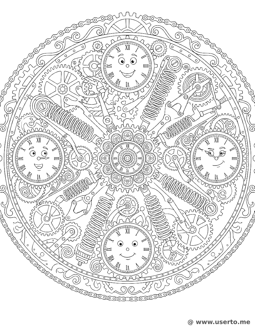 An intricate steampunk mandala filled with complex gears, springs, and ticking clock faces.