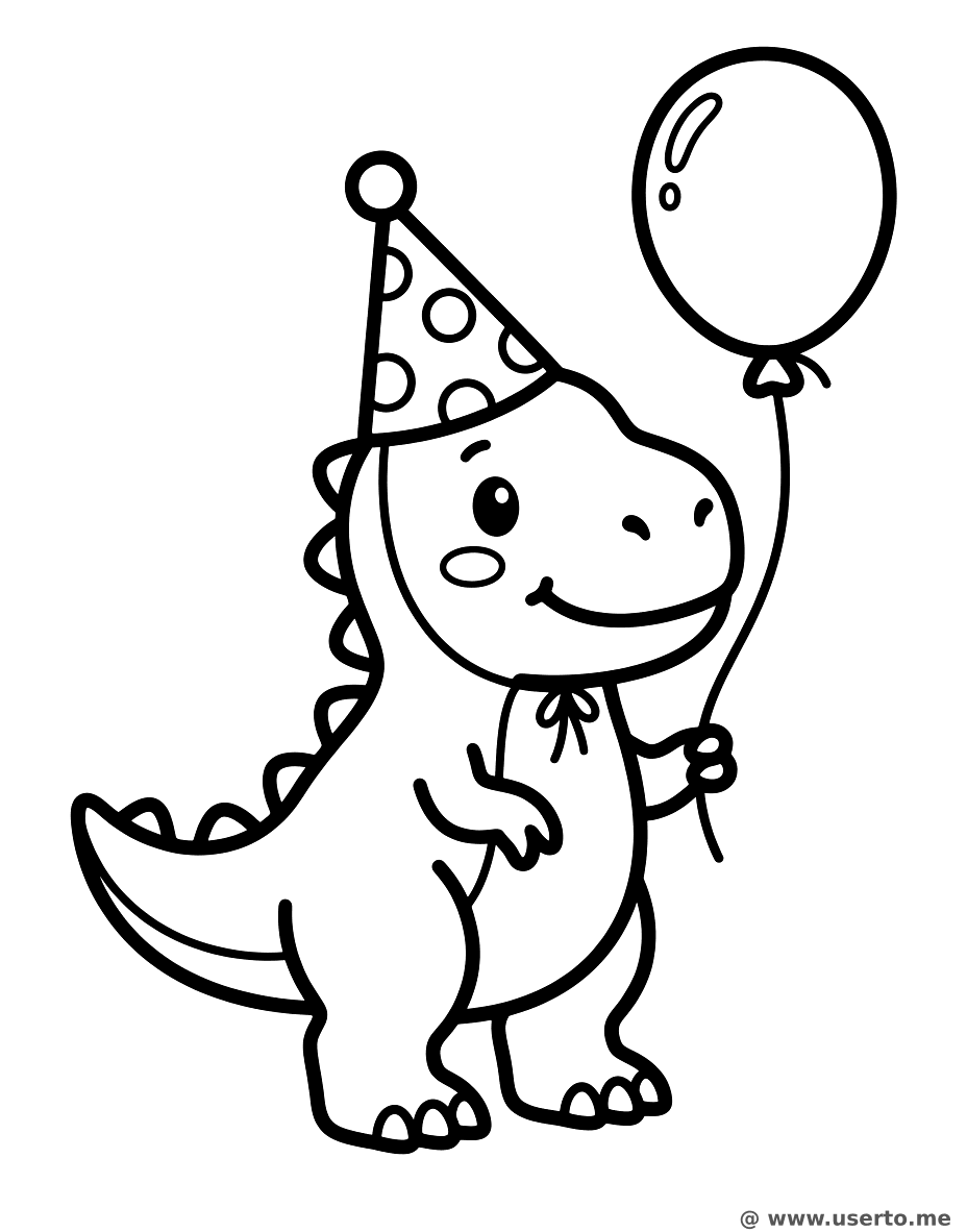 A cute baby T-Rex wearing a party hat and holding a big balloon.