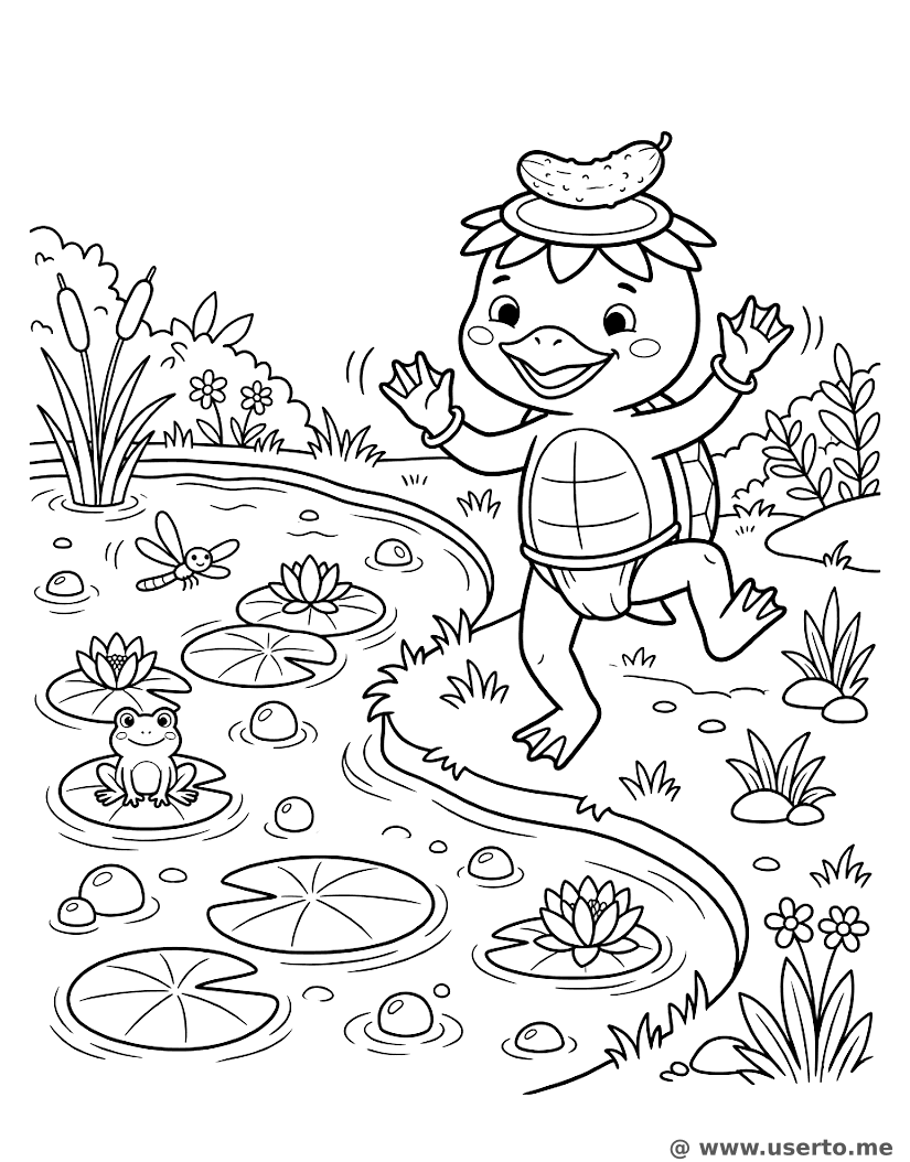 A friendly water imp dancing by a pond while balancing a cucumber on its head.