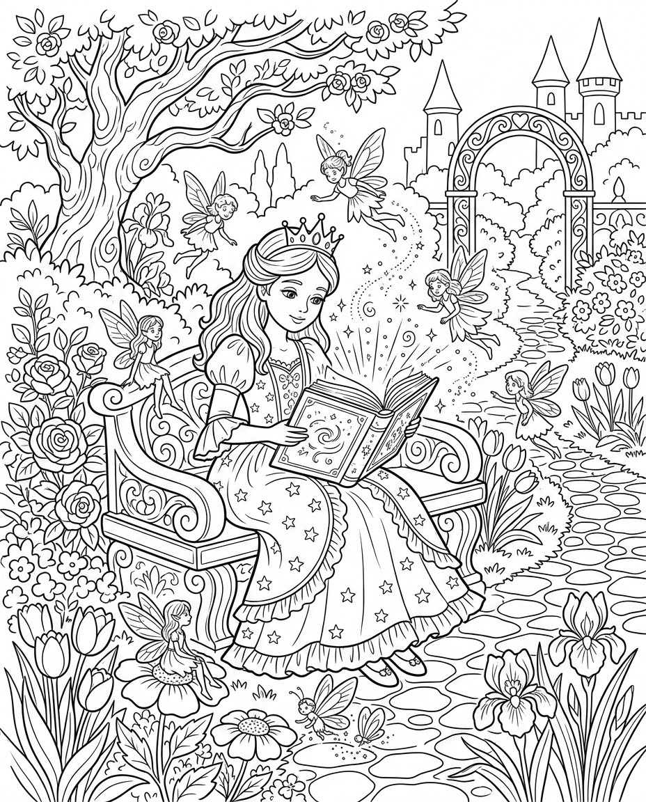A princess reading a glowing magic book in a detailed royal garden with fairies.