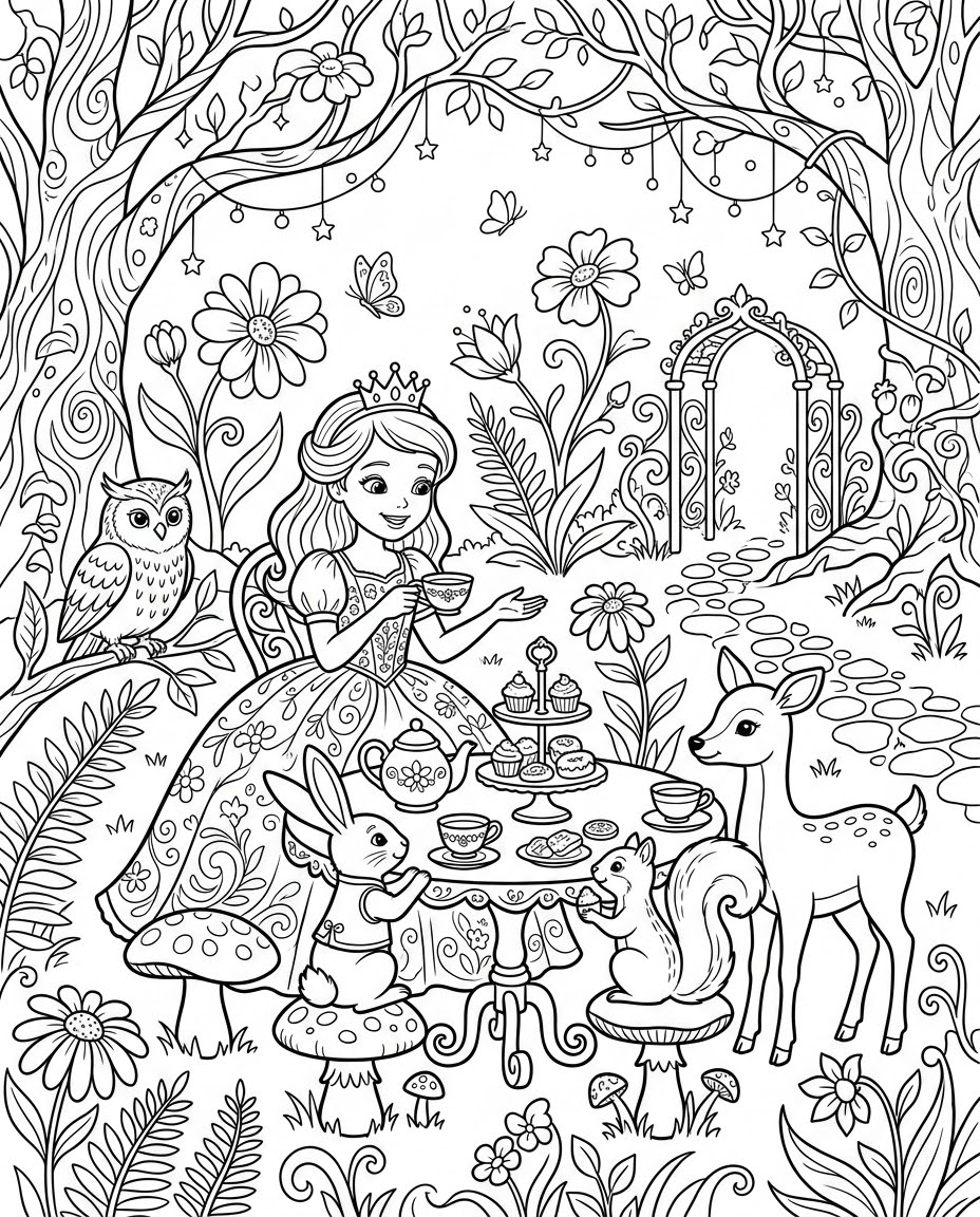 Magical Garden Tea Party is a popular princess, teaparty, garden, animal, magic themed page in the Princesses category. Print this free AI-generated coloring sheet to help your child develop fine motor skills and creativity. High-resolution image optimized for A4 paper is available for instant download.