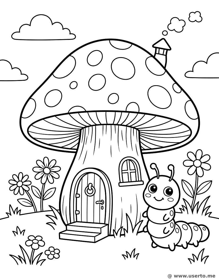 Magical Mushroom House is a popular mushroom, house, magic, caterpillar, fairytale themed page in the Plants category. Print this free AI-generated coloring sheet to help your child develop fine motor skills and creativity. High-resolution image optimized for A4 paper is available for instant download.