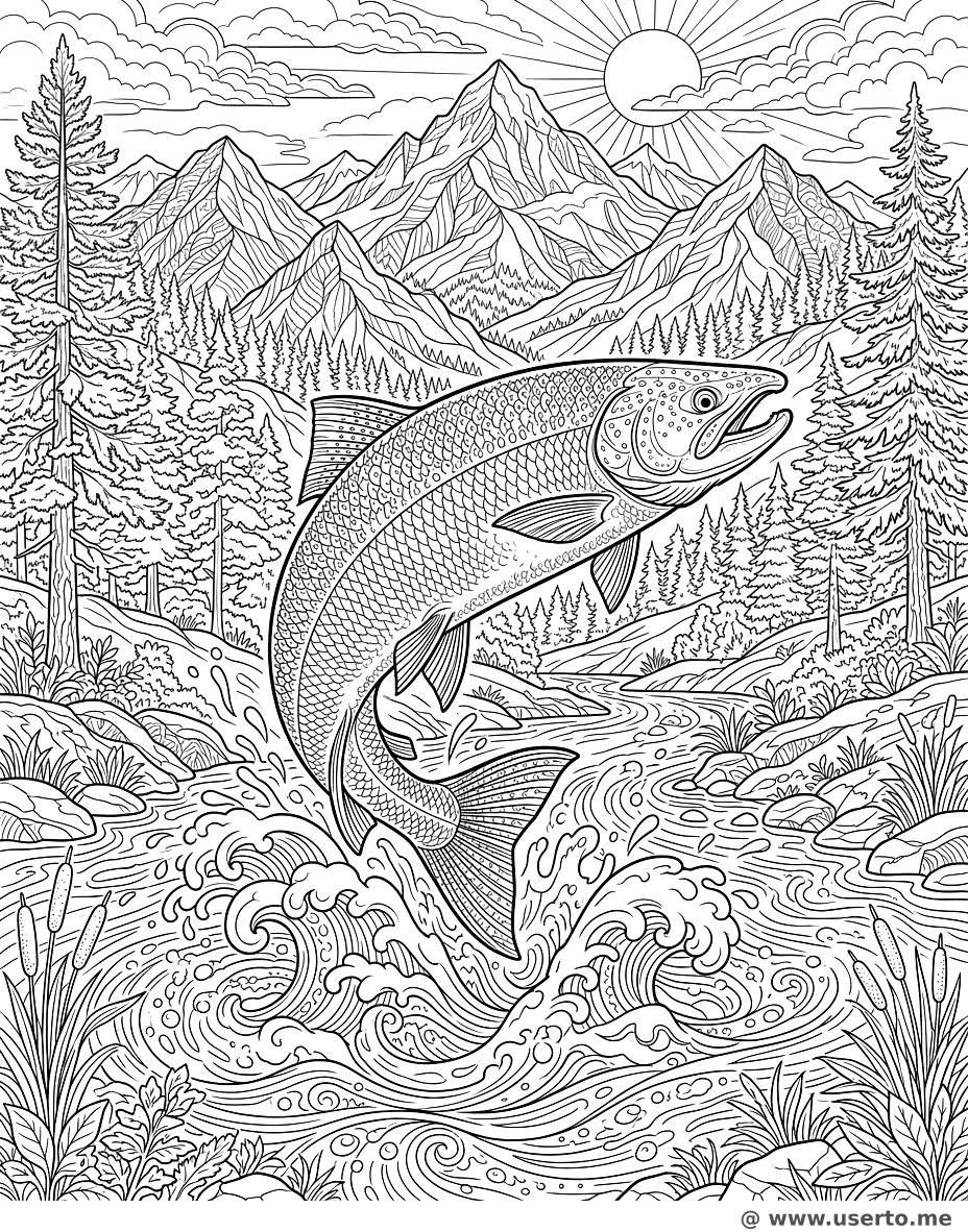Majestic Mountain River Adventure is a popular river, mountain, salmon, nature, scenic themed page in the Nature category. Print this free AI-generated coloring sheet to help your child develop fine motor skills and creativity. High-resolution image optimized for A4 paper is available for instant download.