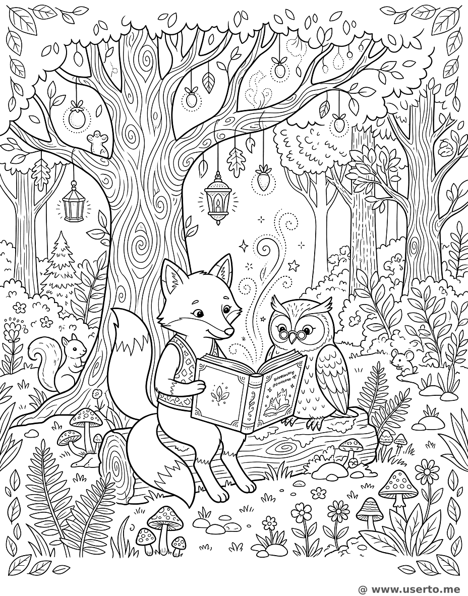 Reading in the Magic Forest is a popular fox, owl, reading, magic, forest themed page in the Animals category. Print this free AI-generated coloring sheet to help your child develop fine motor skills and creativity. High-resolution image optimized for A4 paper is available for instant download.