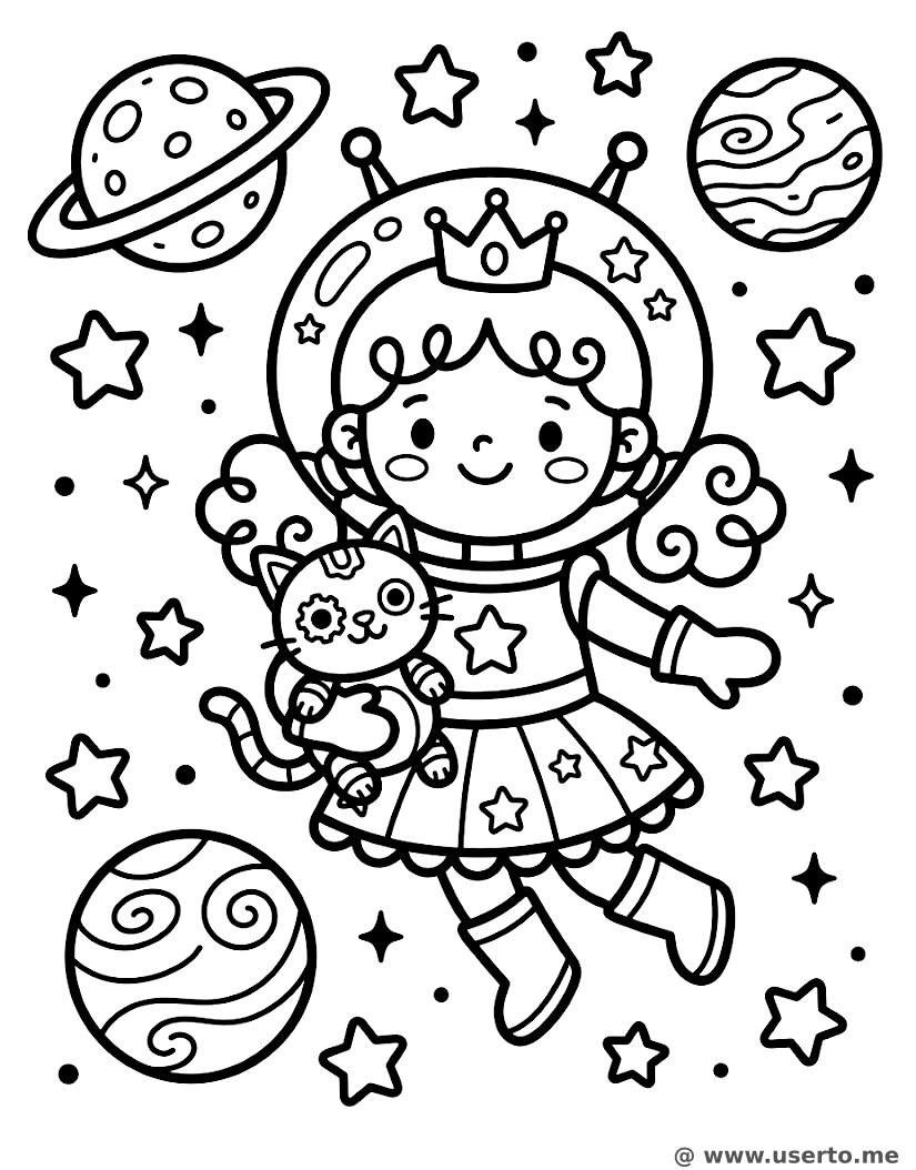descriptionSpace Princess Floating with Robot Cat Coloring Page Description