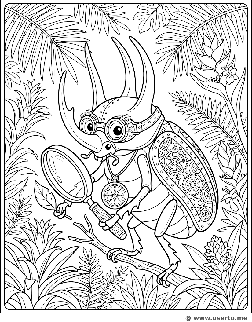 descriptionSteampunk Beetle Explorer Coloring Page Description