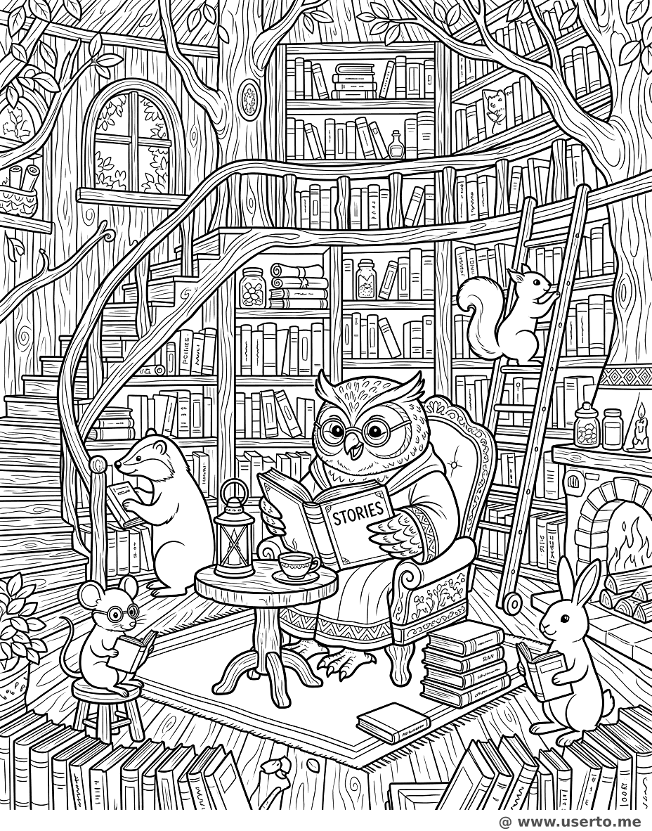 A wise owl reading a book in a detailed tree house library.