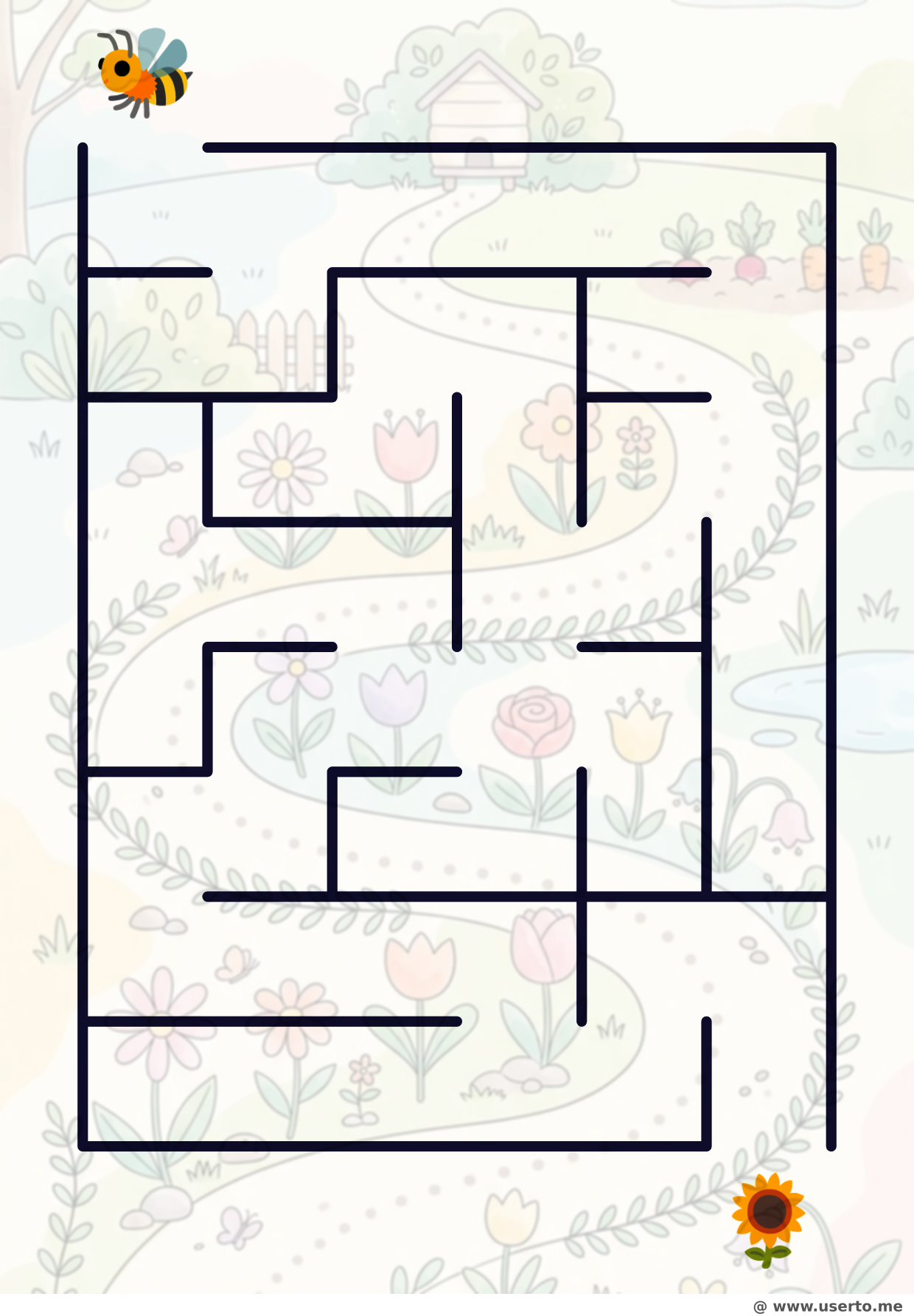 Help the little honeybee navigate a gentle garden path to find the big yellow sunflower.