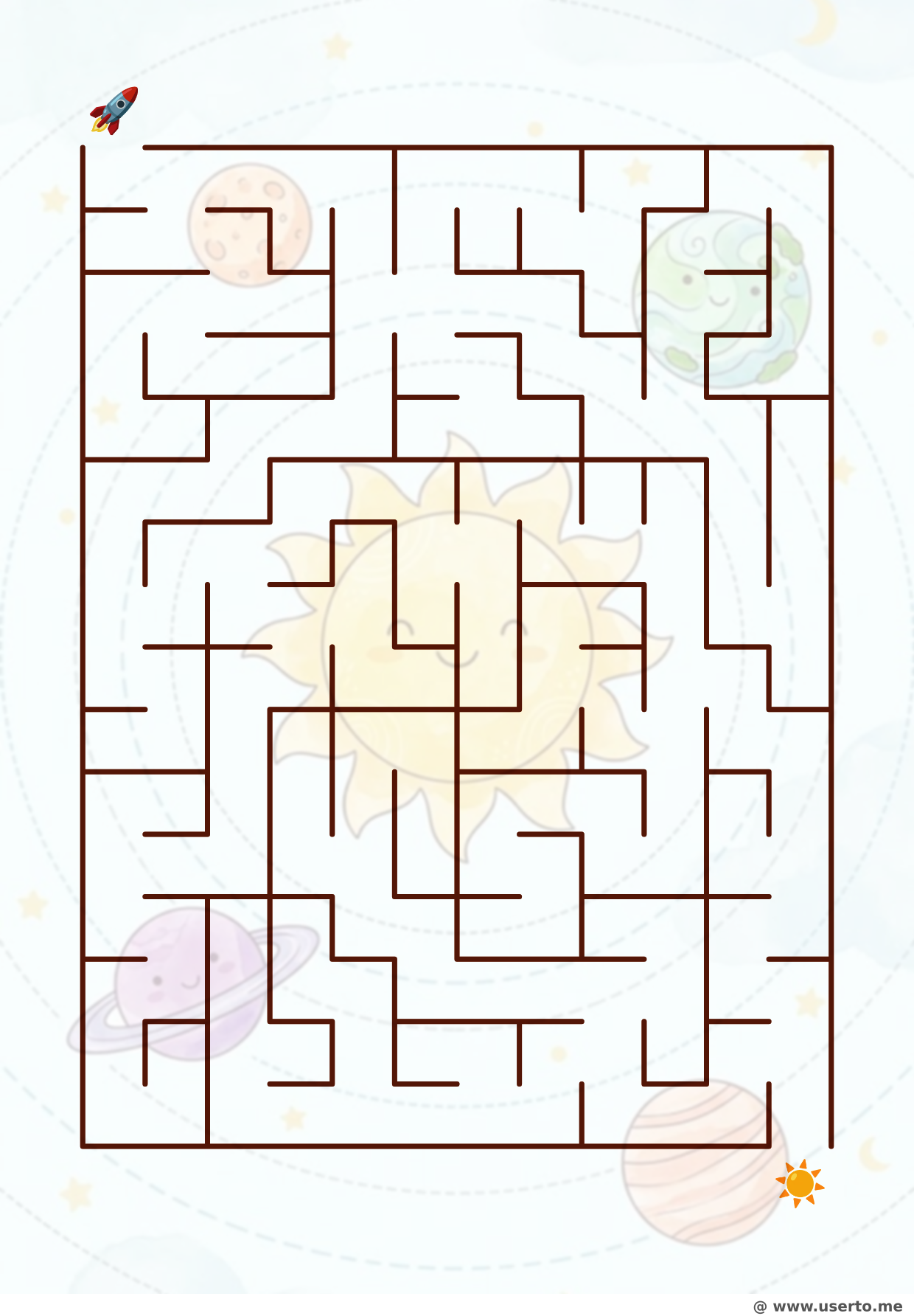 Get ready for a fun challenge with the Orbits of the Golden Sun maze puzzle, a highly popular printable activity in our collection. Featuring exciting space, planets, orbits, cosmos, stars designs, this free, high-quality maze is perfectly formatted for easy A4 printing at home or school. Tracing the path from start to finish requires focus and logic, making it an excellent brain-boosting game that improves children's spatial awareness, visual tracking, and problem-solving abilities. Beyond just logic, mazes are fantastic tools for developing fine motor control. Download this engaging puzzle today to offer your kids a rewarding screen-free experience.