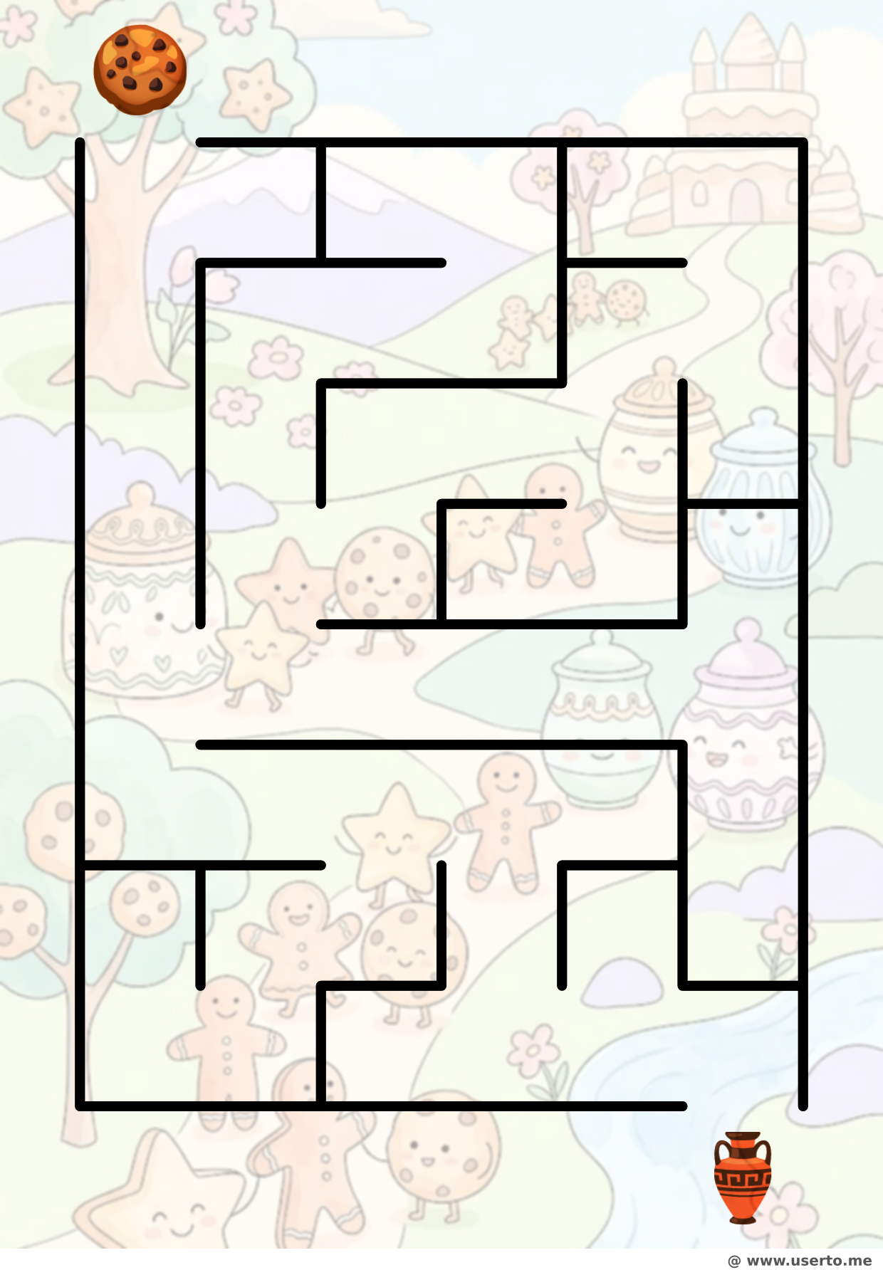 A tiny chocolate chip has fallen off! Guide it across the kitchen counter maze to find its way back into the cozy, warm cookie jar.