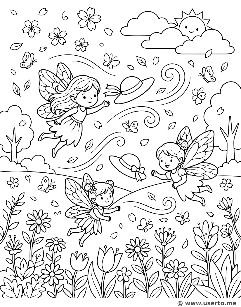 Pequeñas hadas de las flores persiguen sus sombreros voladores durante una mágica tormenta de viento primaveral en un jardín.