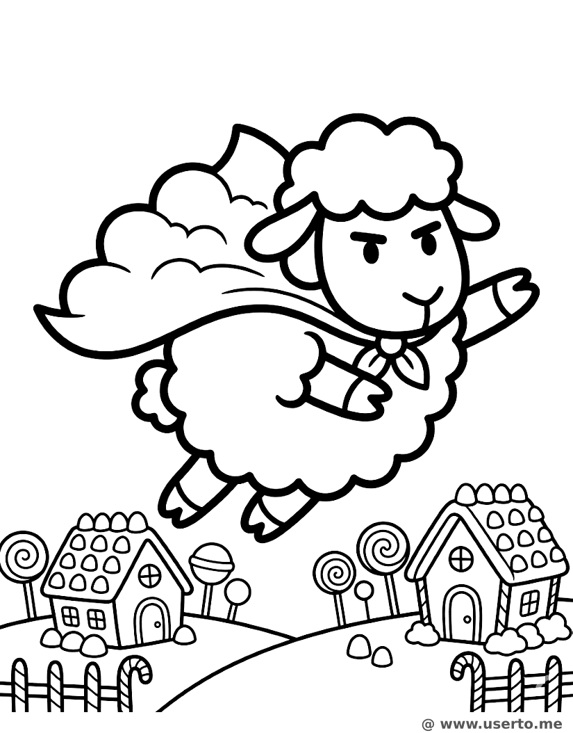 Un superhéroe oveja esponjosa vuela sobre una aldea de caramelos para ayudar a un pequeño amigo.