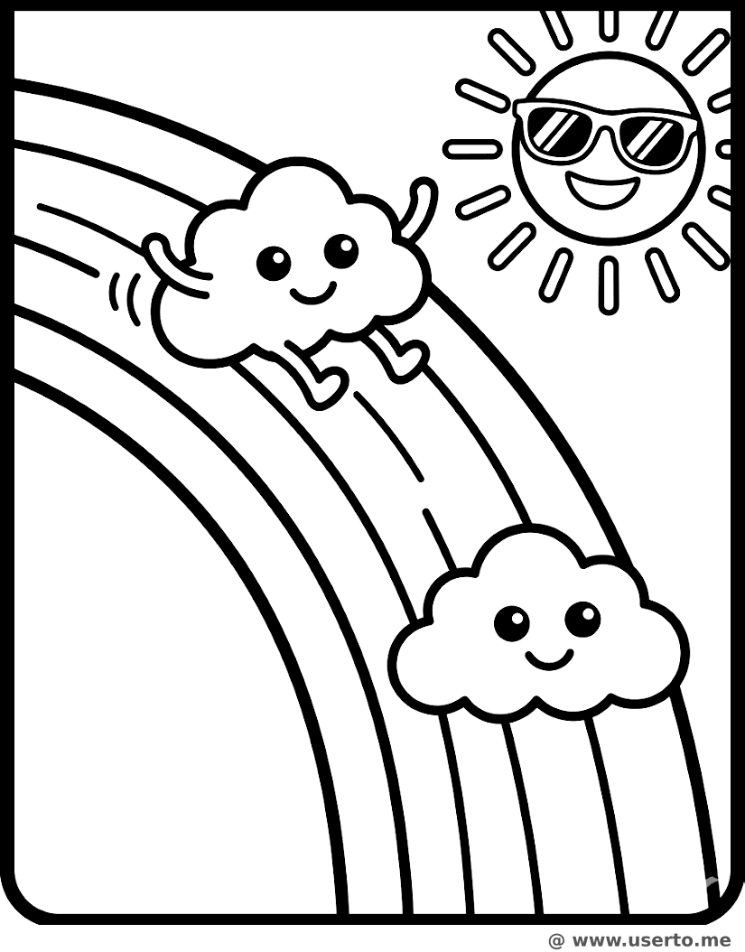Personajes de nubes sonrientes con mejillas rosadas se deslizan por un arcoíris brillante en un cielo soleado.