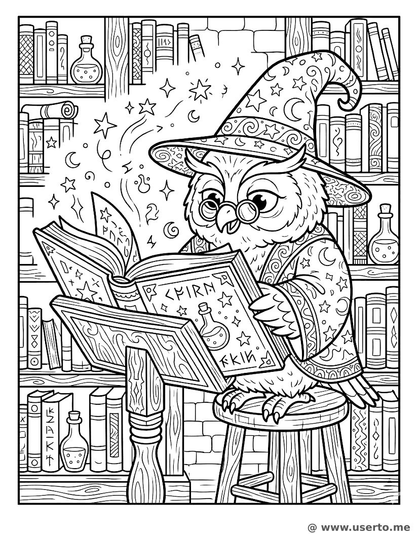 La biblioteca del sabio búho mago - AI Coloring Book: To Me Gratis