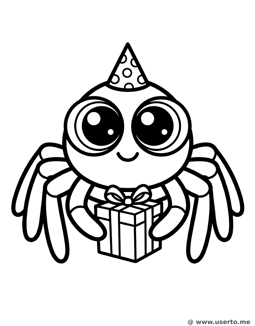 Una simpática araña saltarina de ojos grandes con un gorrito de fiesta y un regalo.