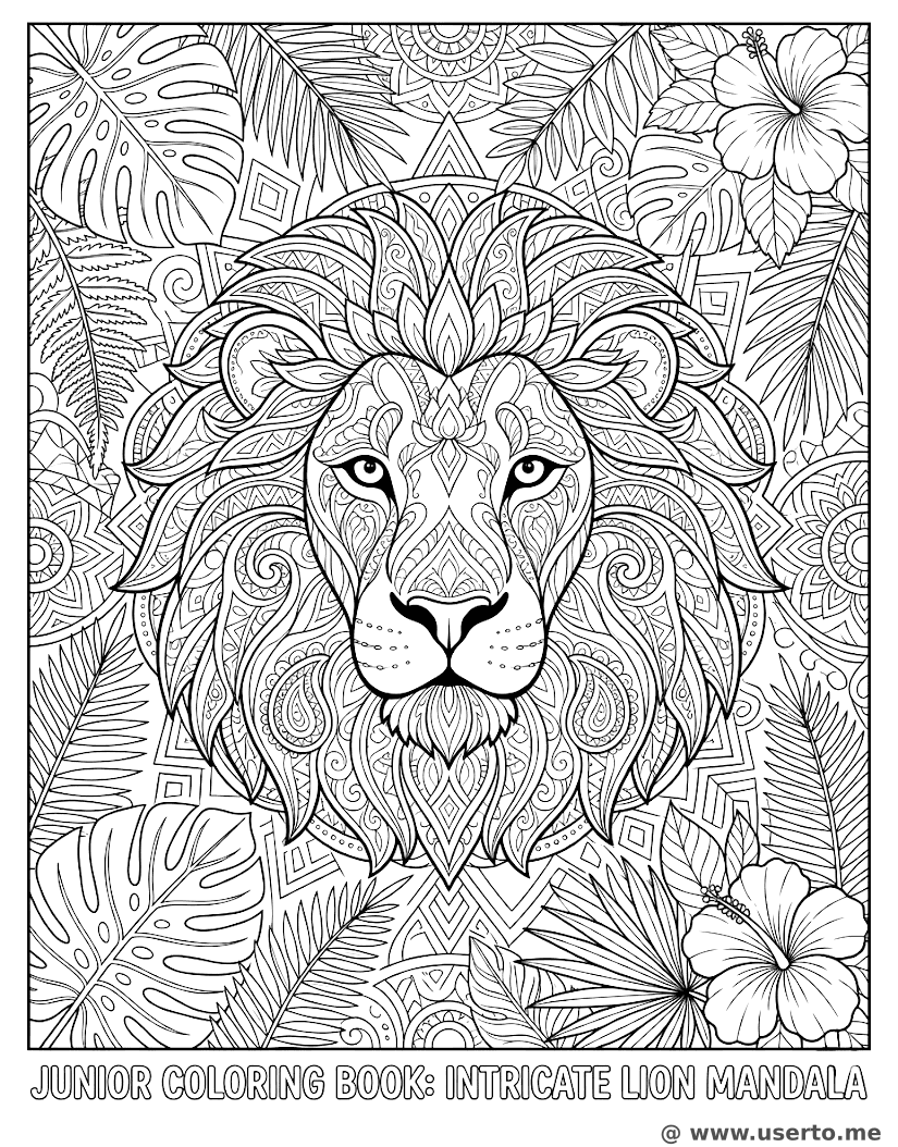 Un mandala complejo que presenta la cara de un león rodeada de patrones de hojas tropicales.