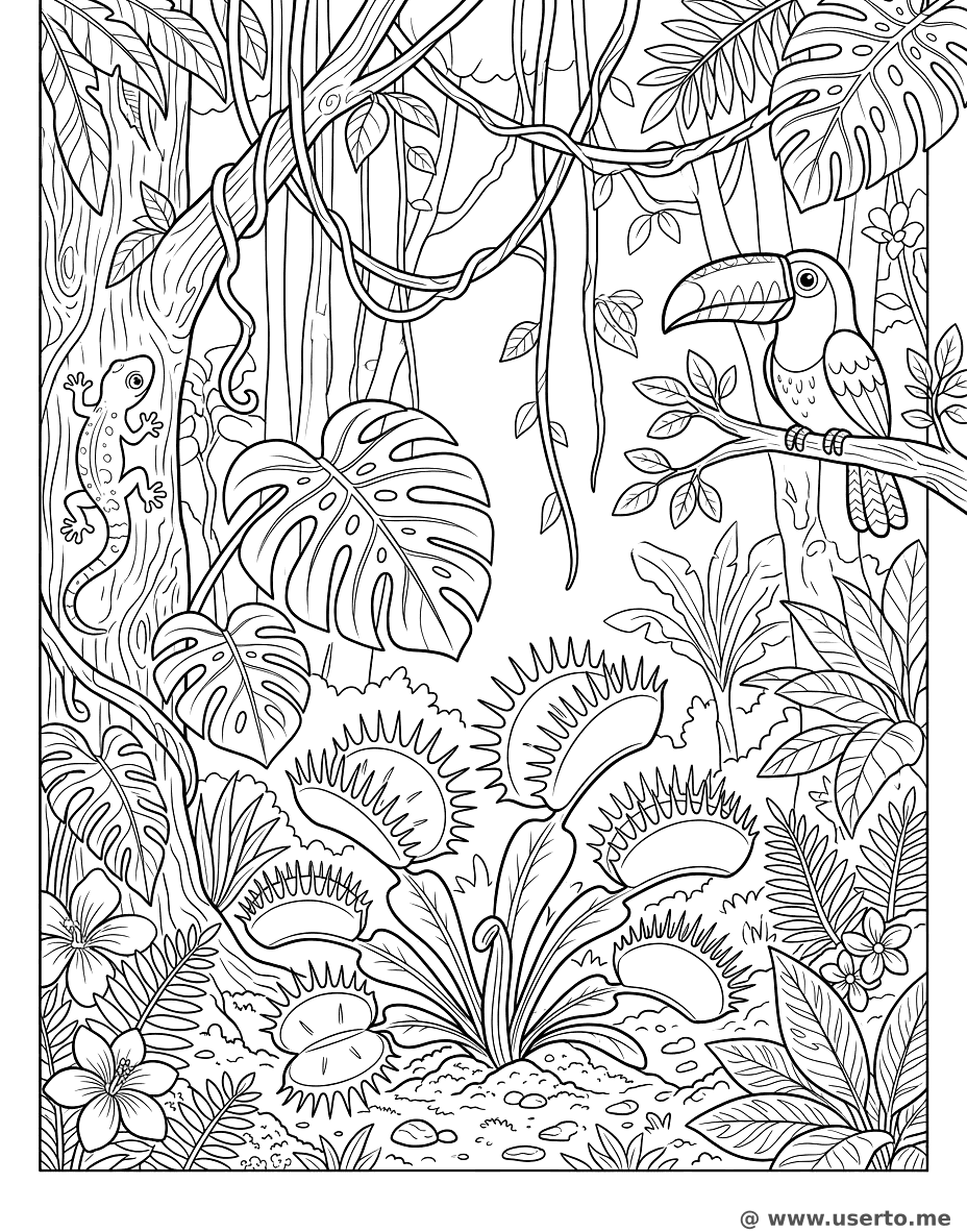 Misterio en la Selva Profunda es una página popular con temática de selva, exótico, atrapamoscas, tropical, exploración en la categoría Plantas. Imprime esta hoja para colorear gratuita generada por IA para ayudar a tu hijo a desarrollar habilidades motoras finas y creatividad. La imagen de alta resolución optimizada para papel A4 está disponible para descarga instantánea.