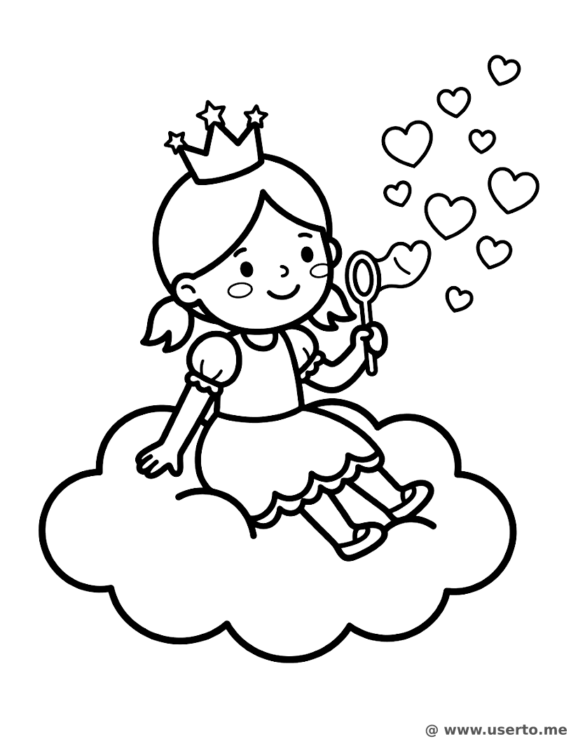 Una gentil princesa sentada en una nube esponjosa que sopla burbujas con forma de corazón.