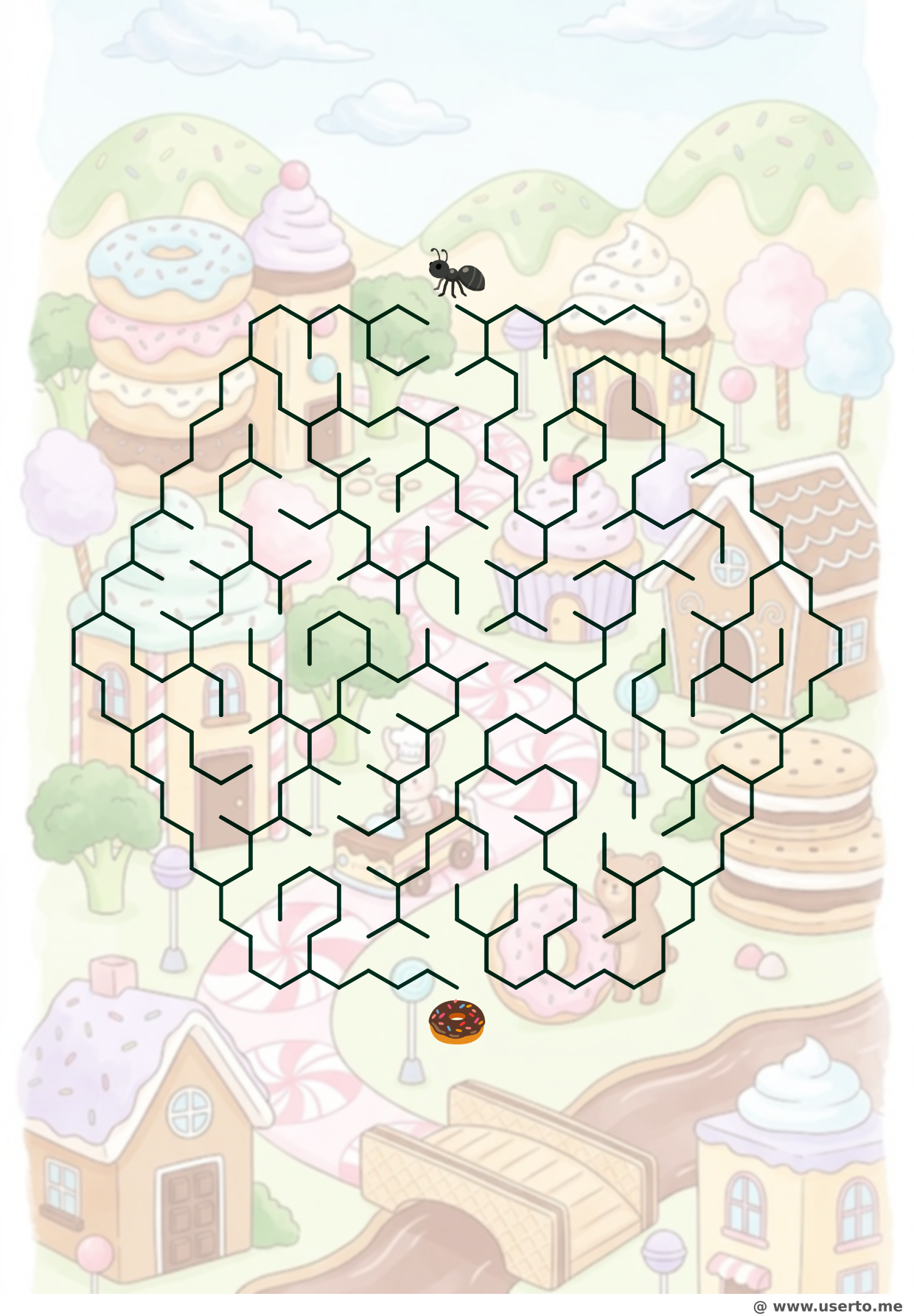 Una hormiga aventurera recorre las calles circulares y glaseadas de Ciudad Dona. Evita las barricadas de chispas para llegar al agujero central azucarado.