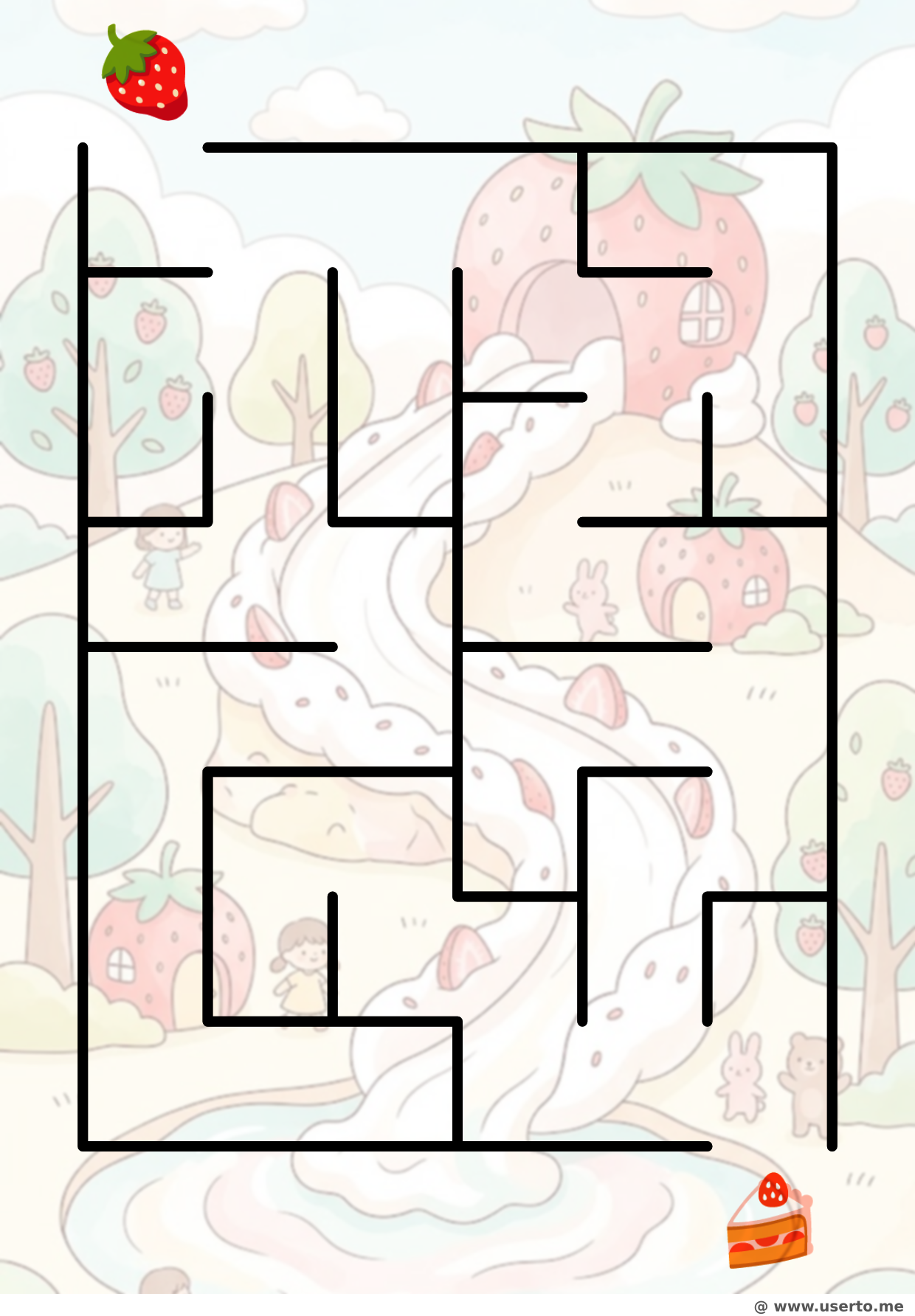 Ayuda a la pequeña fresa a deslizarse por la montaña de nata esponjosa para encontrar su lugar sobre el delicioso pastel.
