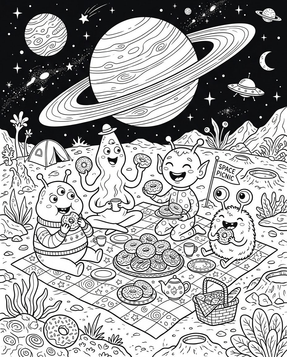 토성 고리 위에서 달콤한 우주 도넛을 나눠 먹는 외계인들.