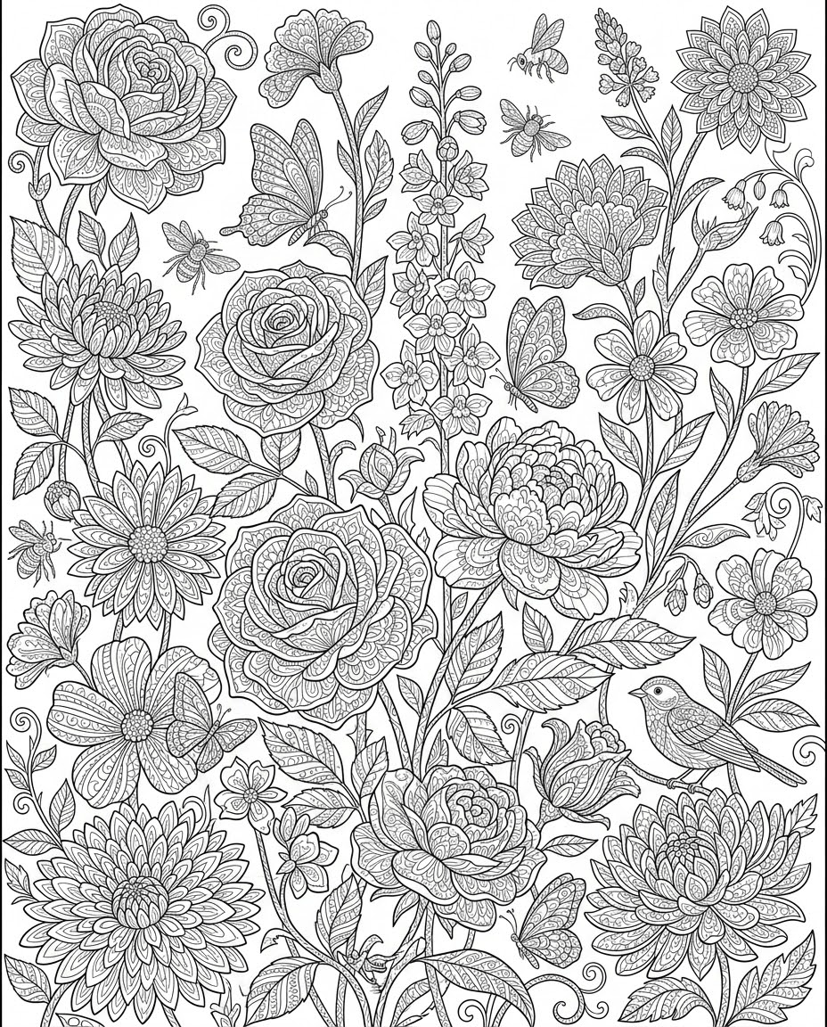 아름다운 꽃과 덩굴로 가득한 정원을 색칠해요.