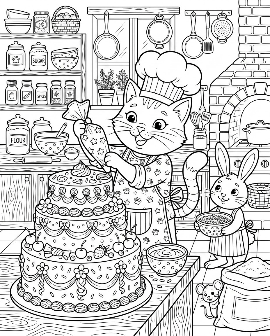 거대한 3단 케이크를 예쁘게 장식하는 신난 파티시에 고양이!