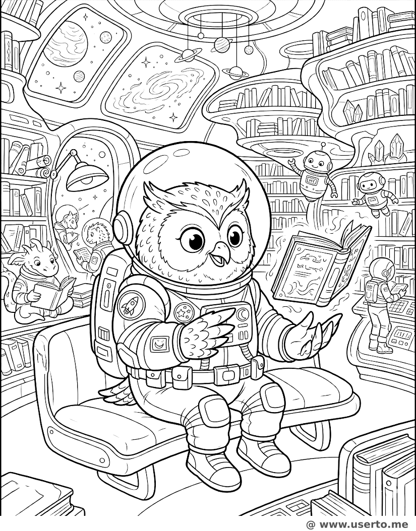 Descubra a espetacular página agradável para colorir maravilhosamente chamada A Grande Biblioteca Cósmica da Sabedoria, projetada de forma muito exclusiva em torno do sempre fascinante tema impressionante de Espaço. Apresentando os notáveis coruja, biblioteca, livros, sabedoria, explorador, esta folha para colorir imprimível é absolutamente e totalmente gratuita, perfeitamente e cuidadosamente otimizada para ótimo papel padrão A4 ideal. As amáveis crianças adoram desfrutar de grande e infinita diversão criativa altamente estimulante enquanto rapidamente desenvolvem capacidades motoras excelentes diariamente em suas amorosas casas. Imprima para atividades maravilhosas, construtivas e estupendas hoje mesmo.