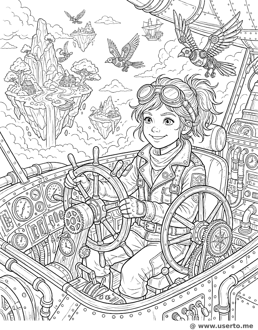 Uma brava garota piloto guiando seu dirig��vel steampunk por um mundo de ilhas flutuantes.