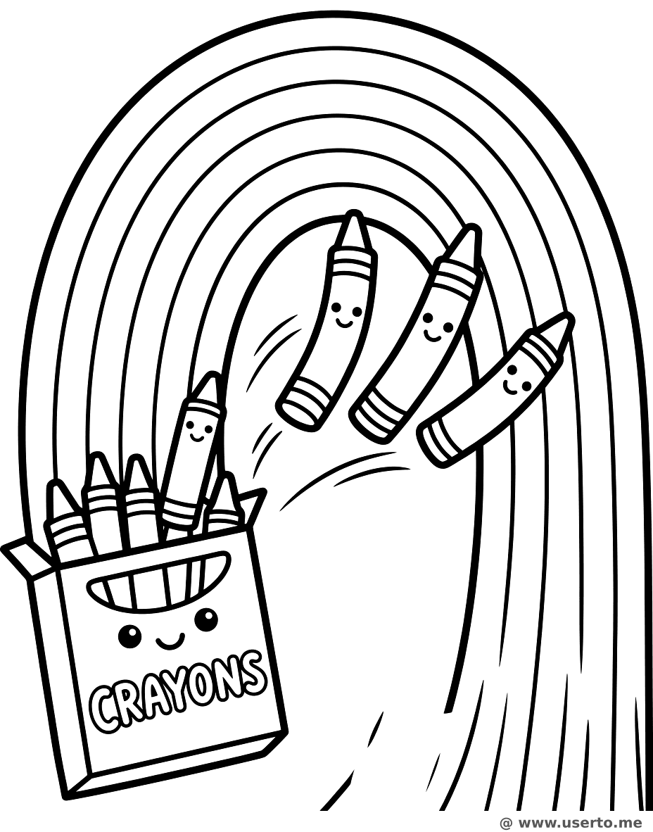 Uma caixa de giz de cera pulando para fora e desenhando um arco-íris juntos.