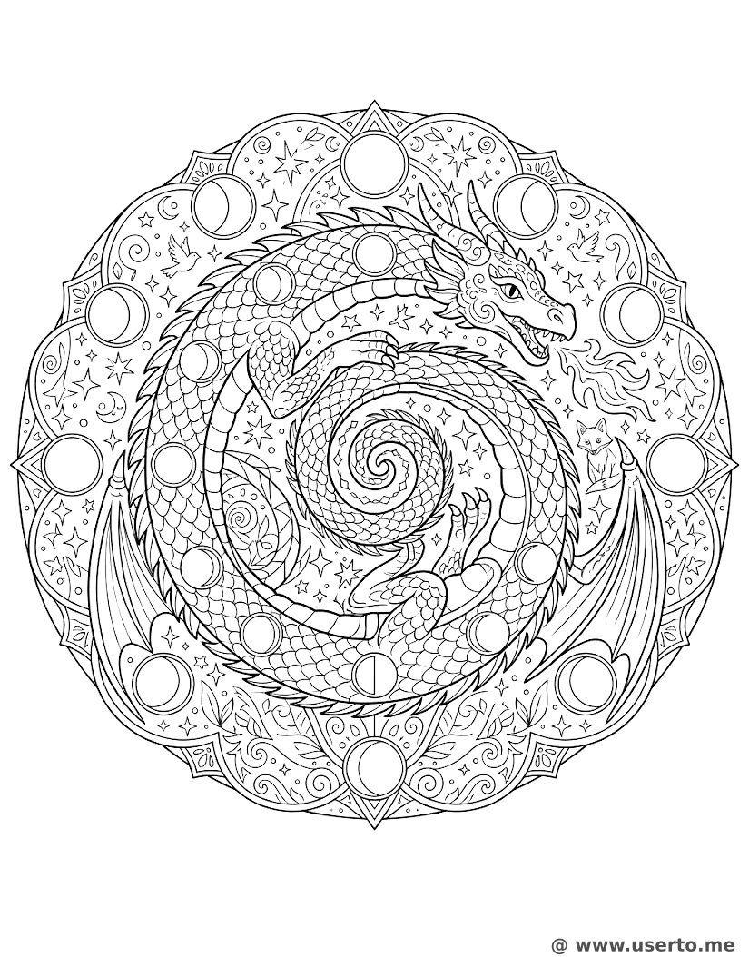 Um dragão majestoso que guarda a galáxia, enrolado numa mandala de estrelas e fases lunares.